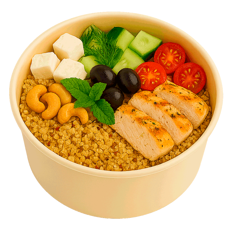 Un mélange harmonieux de quinoa moelleux et de poulet à la grecque parfumé aux herbes, accompagné de concombre croquant, de tomates cerises juteuses, d’olives noires, et de feta fondante.